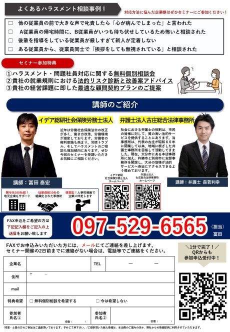 ハラスメントを行う問題社員への対応等について、詳しく知りたいという会社様は是非参加いただきたいと思っています。